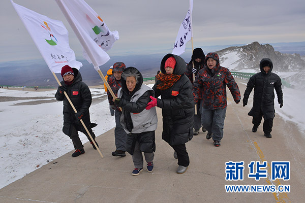 2014年首届长征运动会,杜地(二排左一)同母亲登长白山(资料图)。